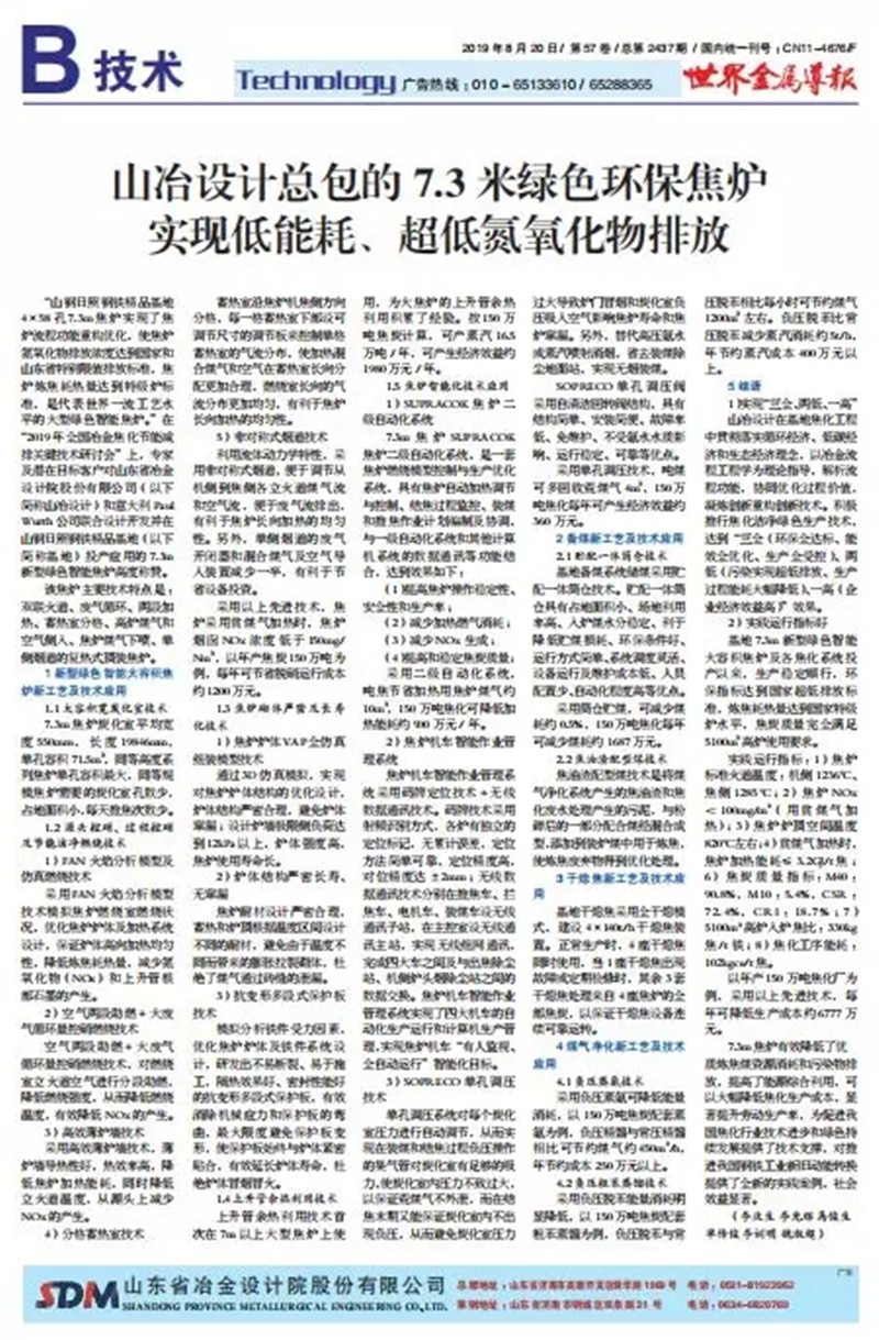 “SDM大型綠色智能焦?fàn)t技術(shù)”是山冶設(shè)計(jì)與意大利PW公司合作的代表世界一流工藝水平的大型焦?fàn)t技術(shù)。由山冶設(shè)計(jì)進(jìn)行整體規(guī)劃及設(shè)計(jì),采用了分段加熱、非對(duì)稱式煙道、薄爐墻、單孔調(diào)壓、火焰分析模型等技術(shù),具有技術(shù)成熟先進(jìn)、結(jié)構(gòu)嚴(yán)密合理、單孔容量大、占地面積小、熱工效率高、自動(dòng)化水平高、環(huán)保指標(biāo)先進(jìn)等諸多優(yōu)點(diǎn)。在焦?fàn)t爐體、焦?fàn)t機(jī)械、工藝裝備、自動(dòng)化和環(huán)保水平等方面代表國(guó)際先進(jìn)水平。同時(shí),在世界上首次運(yùn)用焦?fàn)t爐內(nèi)脫硝工藝,氮氧化物排放指標(biāo)符合國(guó)家最嚴(yán)環(huán)保排放標(biāo)準(zhǔn)。