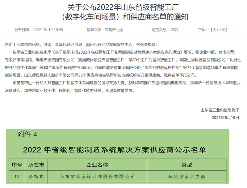 日前,山東省工業(yè)和信息化廳公布了2022年山東省級智能工廠(數(shù)字化車間場景)和供應(yīng)商名單,我公司入選智能制造系統(tǒng)解決方案供應(yīng)商。